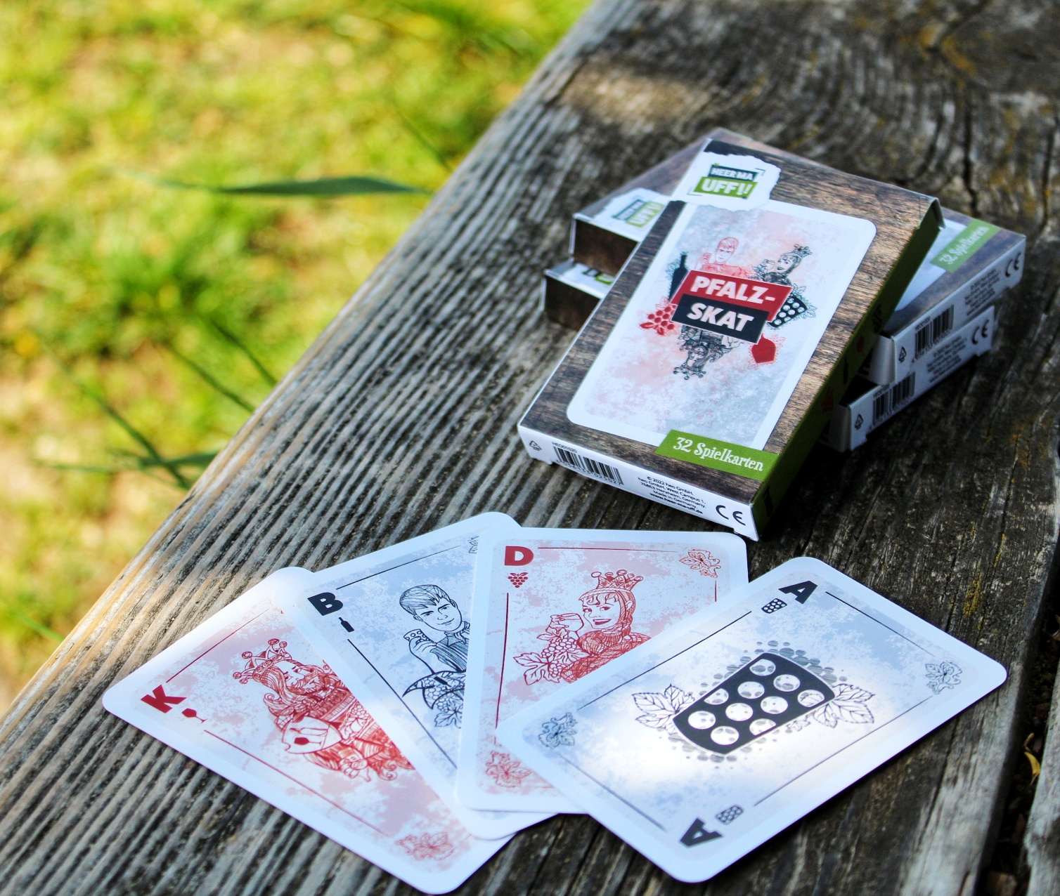 Das Skat-Set besteht aus 32 Spielkarten. Das besondere daran ist, dass wir hier keine Standard-Symbole wie Herz, Pik etc. verwendet haben, sondern sich bei unserem Spiel die Pfalz in Form vom Dubbeglas, Weinreben, Stilglas oder einer Weinflasche wiederfindet.